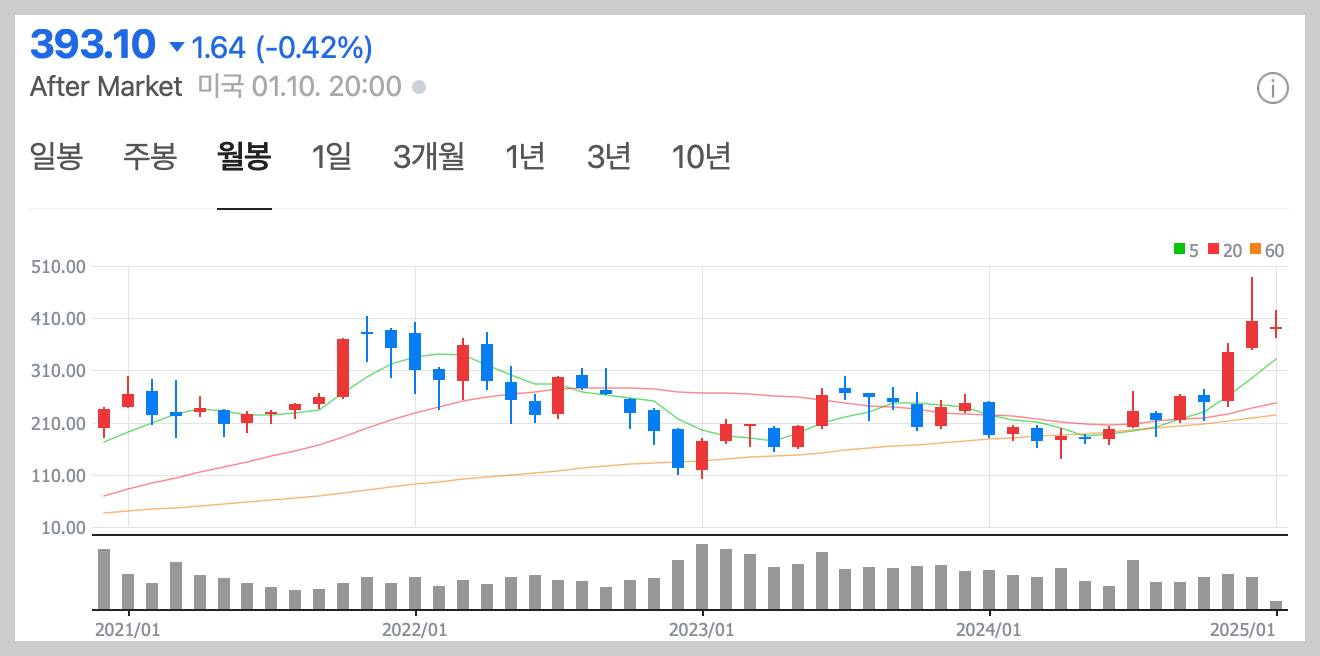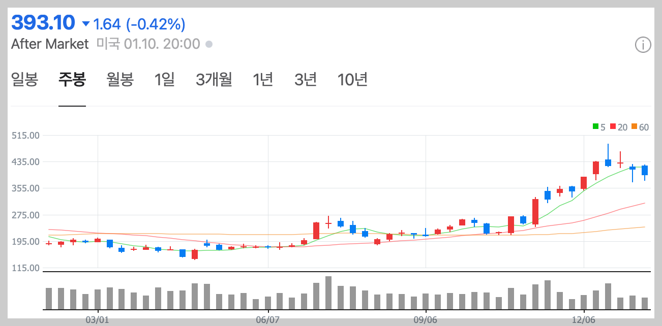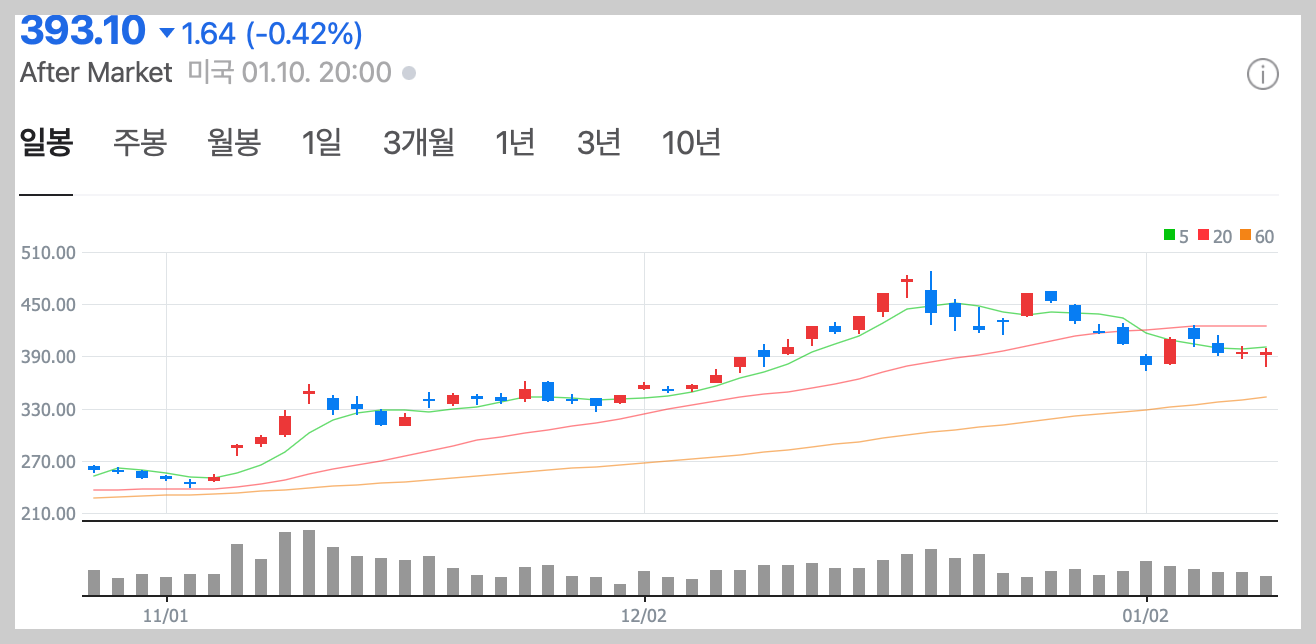 현재는 393달러의 주가를 가지고 있으며, 상승 이후 횡보 하락을 이어지고 있는 상황으로 보이고 있습니다.