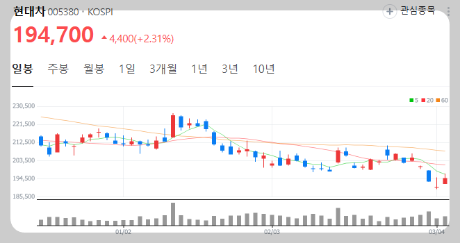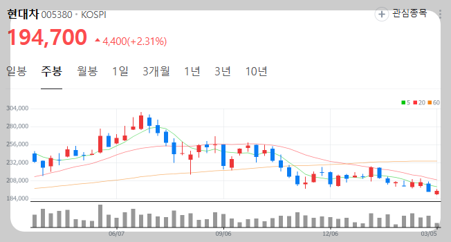 현대차 주가 전망 및 상승 이유 2025년 주가목표에 대해서 알아보도록 하겠습니다. 2025년 3월 5일 현대자동차 주가가 급등을 하면서 많은 사람들에게 다시 관심을 받고 있습니다. 주춤하였던 현대차 주가가 상승하는 이유와 2025년도 주가 목표까지 같이 살펴보며 알아보도록 하겠습니다.